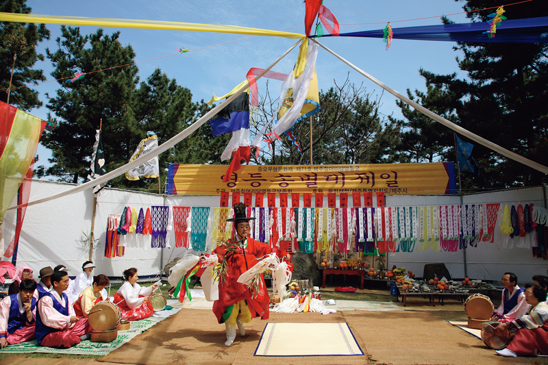 Because diving is an occupation fraught with the risk of death, haenyeo traditionally pray to the sea deities for safety and an abundant catch before plunging into the ocean depths. The photograph shows a Yeongdeunggut, one of the representative village rituals of Jeju.