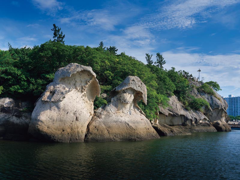 Five kilometers east of Samhakdo by car, two eye-catching rocks known as Gatbawi rise from the coast. They resemble two people standing side by side wearing satgat — traditional conical hats woven from bamboo or reeds. According to legend, monks once rested on this spot and left behind their hats, which eventually turned into stone. These unusually shaped tuff rocks are a notable geological landmark, which have been designated a Natural Monument. Estimated to be eighty million years old, they were sculpted into their current shape by a combination of weathering and marine erosion.