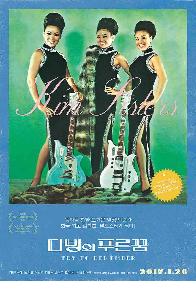 Poster for director Kim Dae-hyun’s documentary Blue Dream of the Teahouse, titled after the eponymous song by Mokpo-born singer Lee Nan-young. The film traces the musical journey of Lee, her composer husband Kim Hae-song, and their daughters, who formed the Kim Sisters, one of Korea’s earliest girl groups.