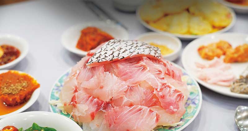 Croaker, a prized summer delicacy from Korea’s western and southern coasts, is valued for its restorative qualities and usually eaten steamed or raw. Called mineo hoe when raw, it has a chewy texture and subtle sweetness. While only the flesh is consumed in other regions, restaurants in Mokpo also serve the skin, swim bladder, and fins, drawing food enthusiasts to the city each croaker season.