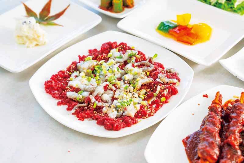Among Mokpo’s iconic specialties is whiparm octopus, or saebal nakji, a small-bodied octopus species with long, thin arms that is prized for its delicate flavor. Pictured here is nakji tangtangi, a dish of chopped live octopus mixed with thinly sliced raw beef.