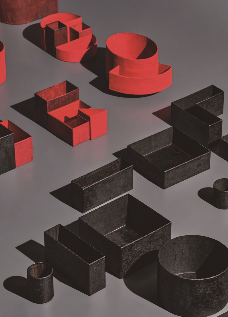 When used in conjunction with hanji, lacquer opens up an entirely different set of aesthetic and functional possibilities. Lighting designer Jungmo Kwon delicately folds hanji into rhythmic, flowing forms, or coats it in black lacquer, combining the resulting paper with various metal armatures. Each completed piece transforms into a lighting fixture that transmits light differently, depending on the treatment of the paper.