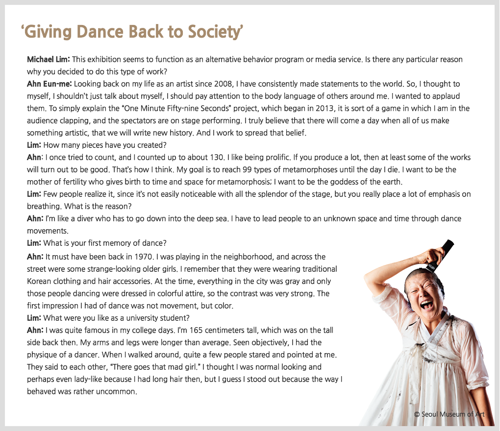 The museumgoers’ favorite moment is Ahn Eun-me’s body-shaking lesson. They seem to feel a sense of catharsis at rediscovering their own bodies and learning how to use them on a more approachable stage set up in an art gallery.