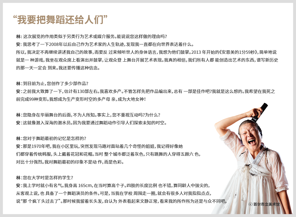 安恩美的梦想就是“把舞蹈还给人们”,这驱使她积极利用标榜多元性的美术馆为媒介。在21世纪美术馆这一全新条件下,她要更新自己,更新舞蹈演员,还要更新观众。长此以往,是不是美术馆也要被她更新了?(王萌译)