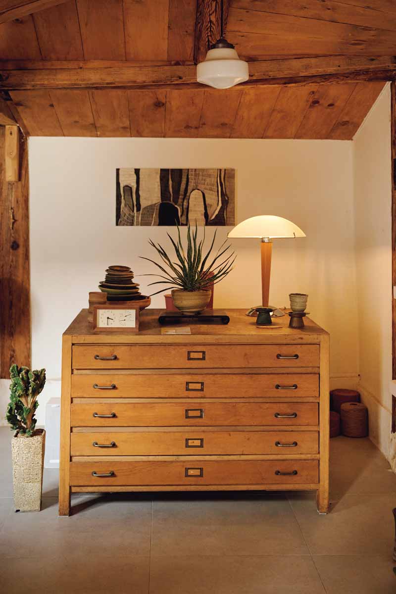 Yu mostly works with Korea’s native plant species. He also collects antique furniture, pots and other objects that complement his bunjae’s understated beauty. Shown here is a vintage file cabinet that Yu found after combing through neighborhoods across Seoul.