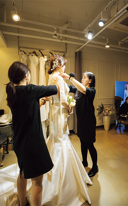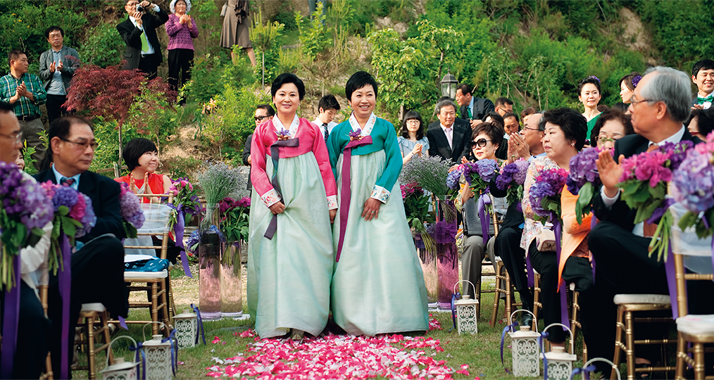 한국 결혼식의 일반적인 형식은 서양식 웨딩이다. 여기에 고유의 전통인 폐백이 부속 행사처럼 딸린다. 폐백은 신부가 서양식 예식이 끝난 뒤 웨딩드레스를 전통 의상으로 갈아 입고 시댁의 어른들에게 인사하는 의식이다. 과거에는 혼례를 마치고 친정을 떠나 시댁으로 가면서 이루어지던 의식을 요즘은 결혼식장에서 예식을 마치고 곧바로 행하는 것이다. 전통 의상으로 갈아입은 신부가 시댁 어른들에게 큰절을 하고 술을 올린다. 이 때 시댁 어른들이 다산(多産)의 상징인 밤과 대추를 신부에게 건넨다.결혼식장에서 신부만큼 주목 받는 것은 웨딩드레스다. 예전에는 웅장한 트레인을 강조한 웨딩드레스가 주로 인기를 끌었으나 요즘은 분위기를 압도하는 디자인보다는 자신만의 개성을 드러내는 디자인을 고르는 추세이다. 웨딩드레스 숍 디자이너의 조언에도 귀 기울이지만 SNS 등을 통해 얻은 자료를 가지고 와서 자기 주관을 가지고 상담하는 신부가 많아졌다. 그래서 특정 시기에 유행하는 스타일이 많이 없어졌다는 것이 오히려 트렌드다. 패션과 웨딩 드레스의 경계가 모호해지고 있다는 것도 주목할 점이다. 나중에도 활용할 수 있는 드레스에 대한 선호도가 높아지고 있는 것이다. 청담동에서 27년째 웨딩드레스 숍을 운영하는 이명순(Lee Myung-soon) 씨는 “저는 얼마 전부터 대여 대신 판매로 아예 전환했습니다. 웨딩드레스를 일생에 한번 잠깐 입는 거창한 예복이 아닌 자신을 표현하는 도구라고 여겨 의복으로서의 가치에 중점을 두는 신부들이 많아졌기 때문이지요.”라고 말했다.