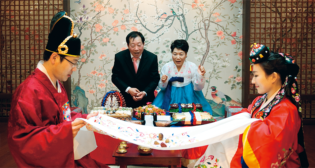 서양식 결혼식의 부속 행사처럼 치러지는 폐백은 서양식 예복에서 전통 혼례복으로 갈아입은 신랑과 신부가 함께 시댁 어른들에게 인사를 올리는 절차이다. 이때 시댁 어른들은 다산의 상징인 밤과 대추를 듬뿍 신부의 치마 폭에 올려준다.
